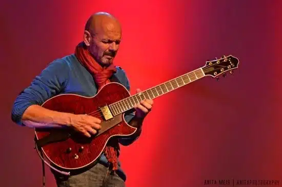 Jan Kuiper with one of his four Benedettos, a Crimson Blaze Bambino Deluxe. Photo by SJU Jazzpodium via Flickr – ‘Jan Kuiper Met Three of a Kind and Bireli LaGrene’