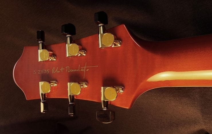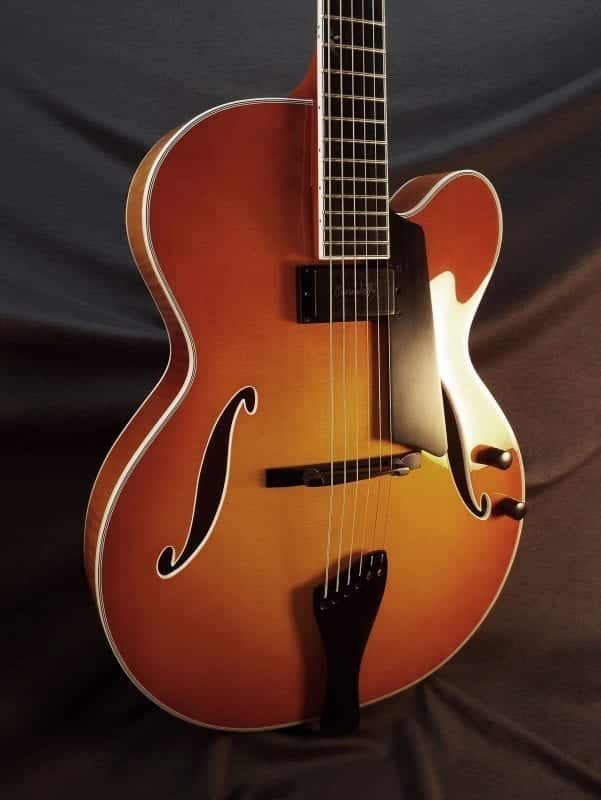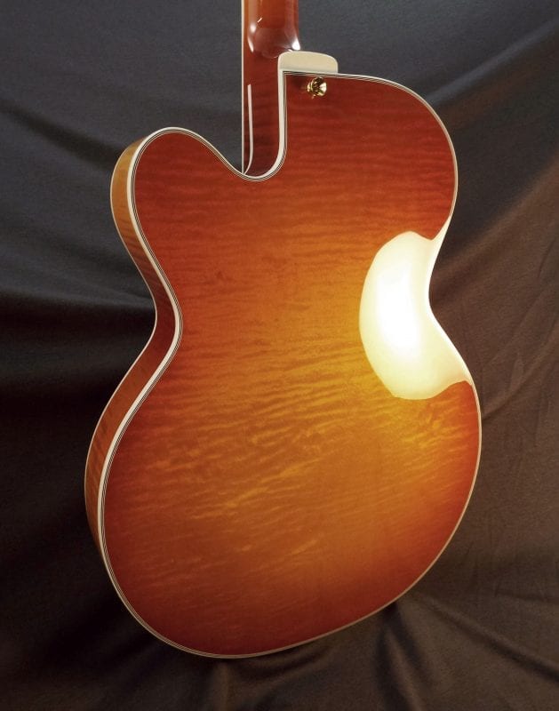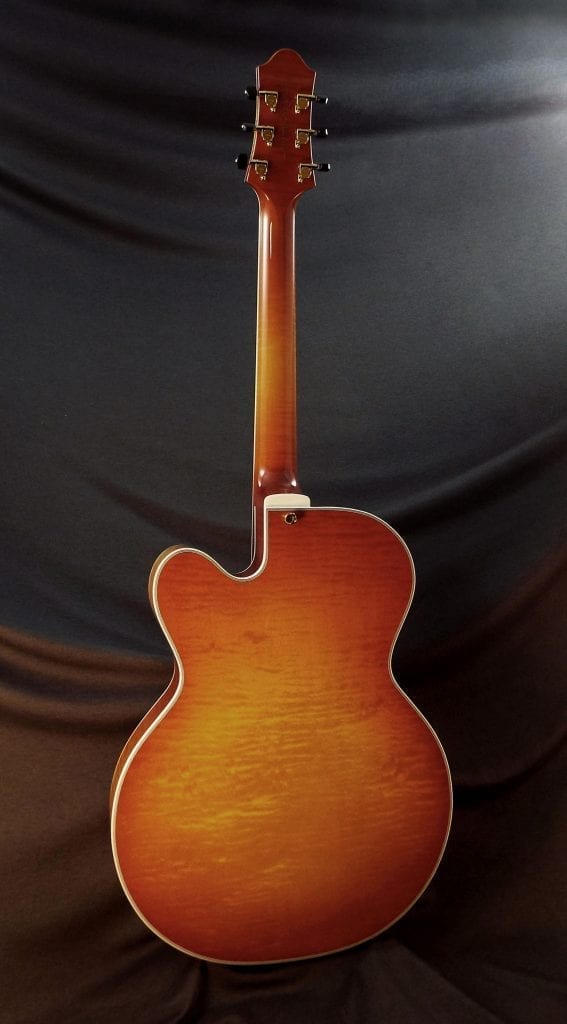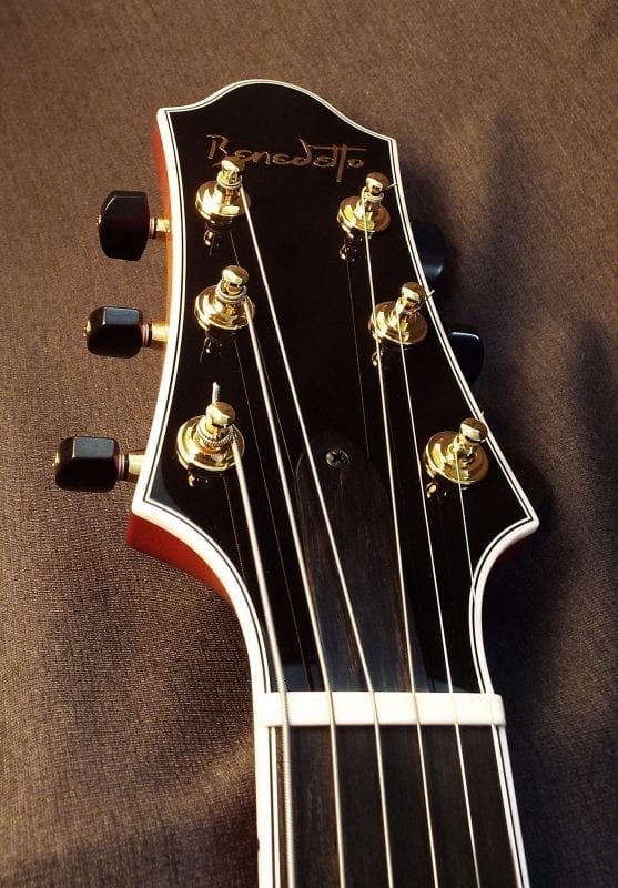 Built in our workshop in Savannah GA with painstaking detail to Bob Benedetto’s design, using his fixtures and workbenches, and by the extraordinary luthiers he trained, this is our most popular laminated design for pro player and devoted hobbyists. 16″ x 2-1/2″ body with laminate spruce top, highly figured maple laminated back, solid maple sides and flamed maple neck.  Ebony tailpiece, tuning buttons, bridge, finger rest and fingerboard, a Benedetto B6 pickup and a hard-shell TKL case included.