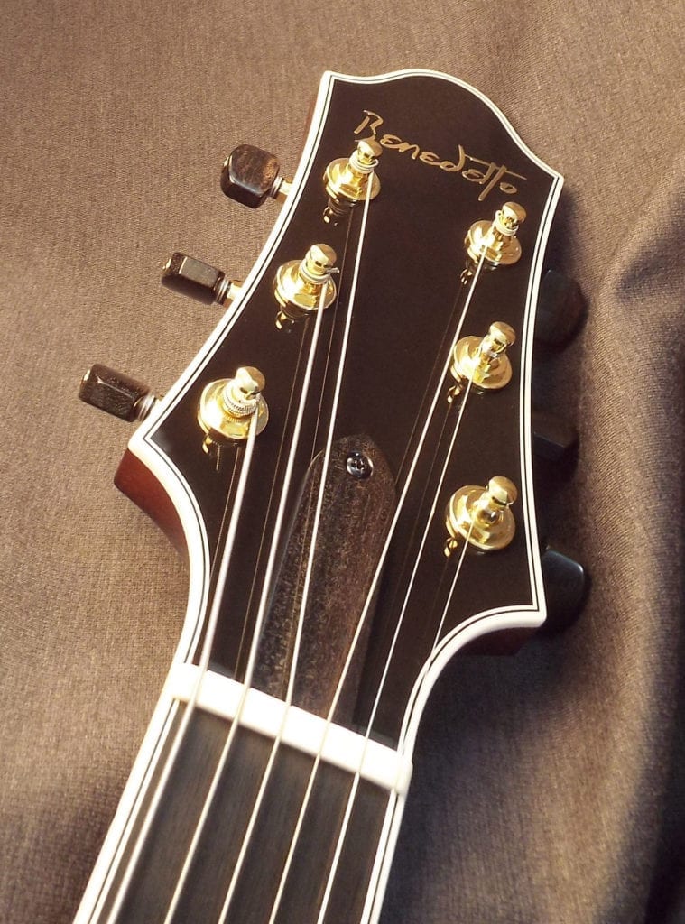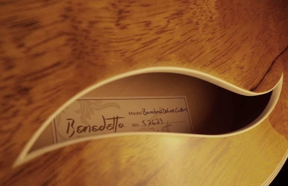 It’s fairly rare that exotic veneers make it onto our benches but when they do we like to make something spectacular! This otherwise standard Bambino Deluxe features a black limba top giving it an utterly unique look. Despite its modern aesthetic, the Bambino Deluxe is equally at home playing traditional jazz as it is tackling more contemporary styles. Additionally, its compact design with a 14 1/2″ body, 1 11/16″ nut width, and 25″ scale make this guitar great for travel or guitarists with a slight build.