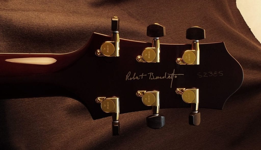 This beautiful Bambino Antiqueburst Lefty is complete and ready for immediate sale! As its name implies, the Bambino is a baby in size…but with a big voice. Lightweight and compact 14 ½” body, this guitar is the traveling musician’s dream. Laminated maple top and back and a maple neck shaped for playing comfort with two chrome plated A–6 pickups. At Benedetto, we don’t up-charge for left handed folks. So, if you’ve been on the sidelines, now’s your chance for instant lefty heaven!