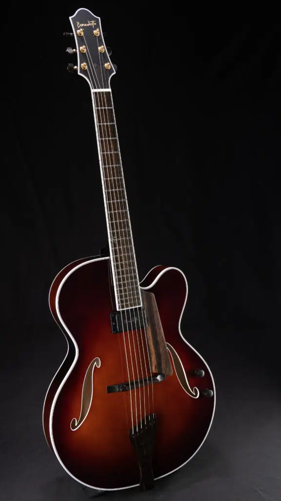 A rare Deluxe in Opulent Brown, this guitar also features some incredible, streaky ebony. We often call this model our workhorse because it checks all of the boxes for a professional instrument; durable, plays well with amplifiers and monitors, fast responding, and a voice that’s 100% Benedetto.