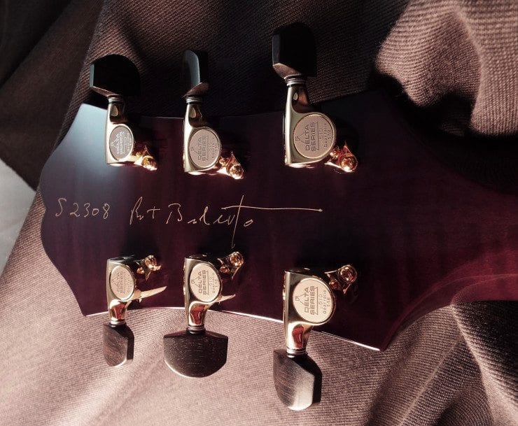 This brilliant and powerful 17″ hand-carved archtop is now available for immediate shipment! The Manhattan is Bob’s most popular pure archtop design, and this one has an S6 floating pickup with thumbwheel volume under the fingerrest, 25″ scale, 1-3/4″ nut, violin tailpiece with endpin input, highly figured European maple back, sides and neck with European spruce top. All ebony appointments, fine-line white/black purfling, and hand signed serial number and Bob Benedetto signature on the back of the headstock. The finish is a unique shade of plumb and espresso – our plumburst.