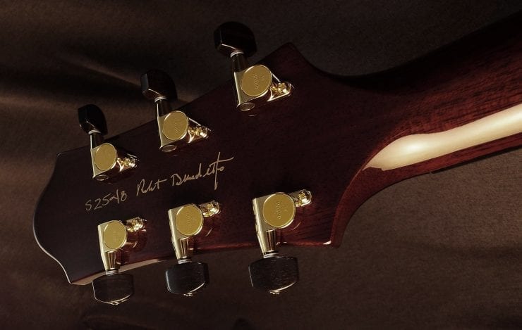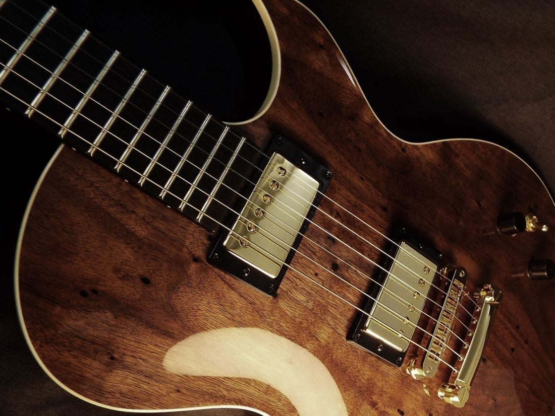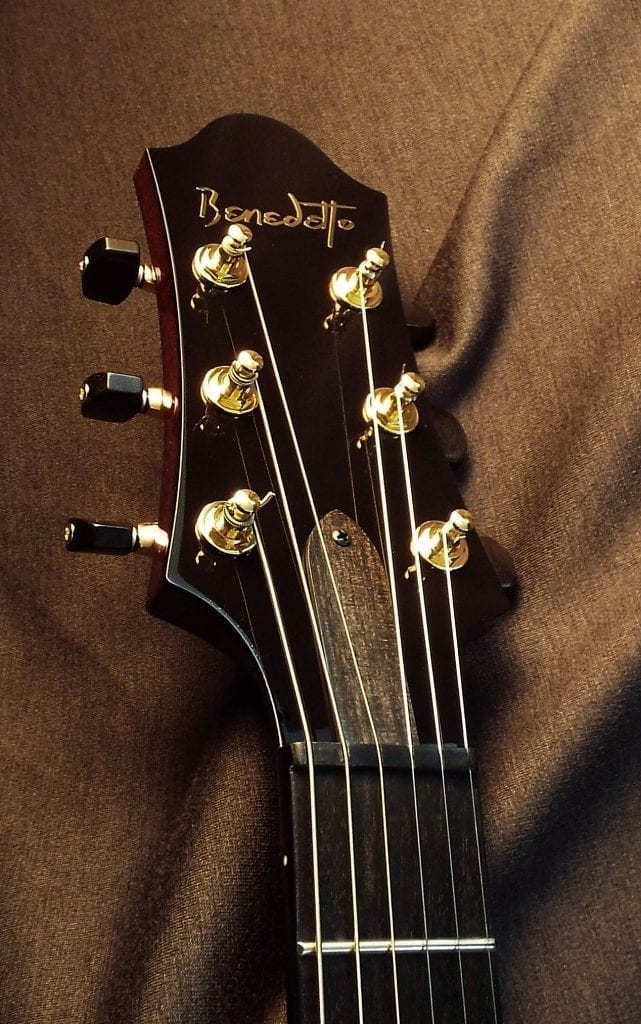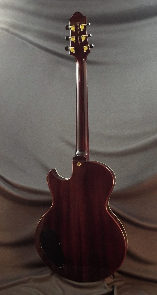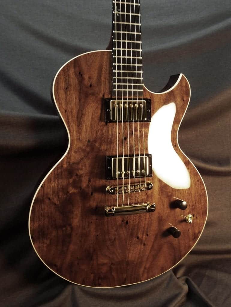 This stunning new addition to Bob’s Boutique is a one-of-a-kind Benny featuring a walnut top with eye catching bark inclusions. The Benny is our go-to guitar for electric players looking to jazz things up or jazz guys and gals looking to for an easy travelling instrument that is entirely absent of the feedback issues sometimes associated with acoustic instruments. Coming in at a sprightly 7 1/2 lbs, with 25″ Scale, 1 3/4″ nut width and dual, A-6 pickups, this guitar a comfortable and versatile choice for any musician or collector.